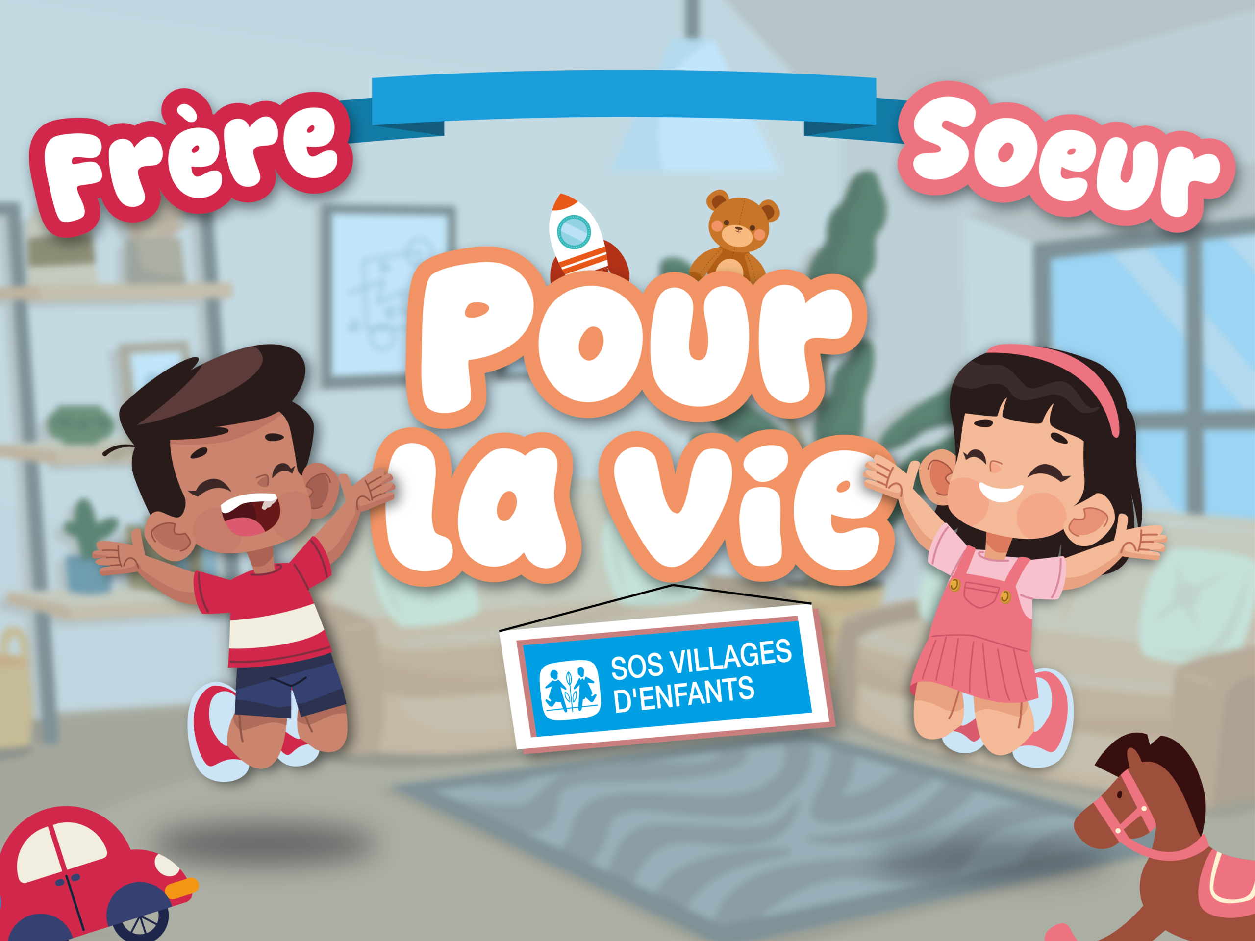 La composition repose sur une ambiance chaleureuse et rassurante, illustrée par un frère et une sœur en train de s’amuser. Cette représentation vise à transmettre des valeurs de joie, de partage et de soutien fraternel.